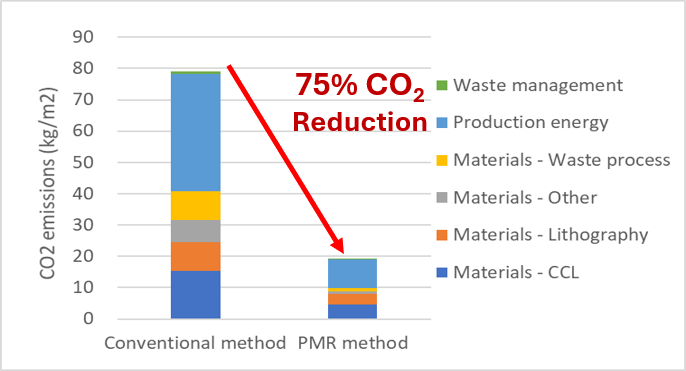 聚醯亚胺膜(Polyimide, PI)直接金属化搭配半加成(Semi-additive process, SAP)的生产技术大幅缩短生产流程,比传统减成法(Subtractive)生产方法使用更少的能源、耗水量、废水等有害物质,最高可减少75%二氧化碳排放,关键在于「製程创新」,是回应全球气候危机与政策趋势的必要行动。